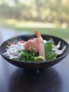 特選海鮮丼は、マグロ、しらす、タイ、カンパチ、タカエビです。